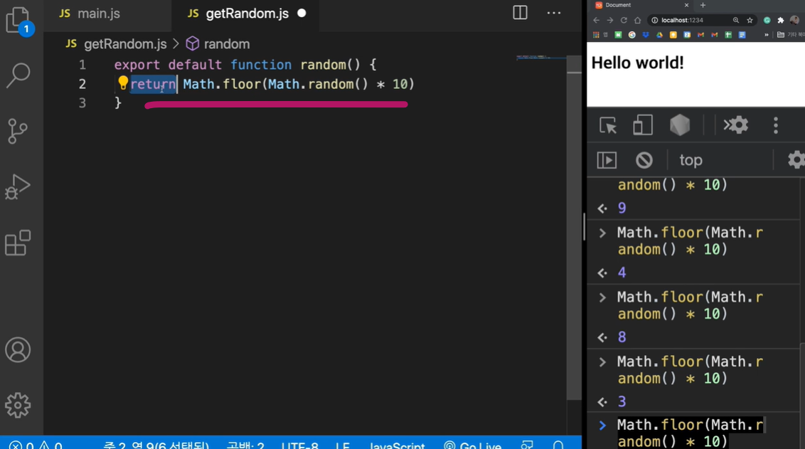 그리고 그 반환된 값이 getRandom이라는 이 자바스크립트 파일 밖으로도 빠져나갈 수 있게