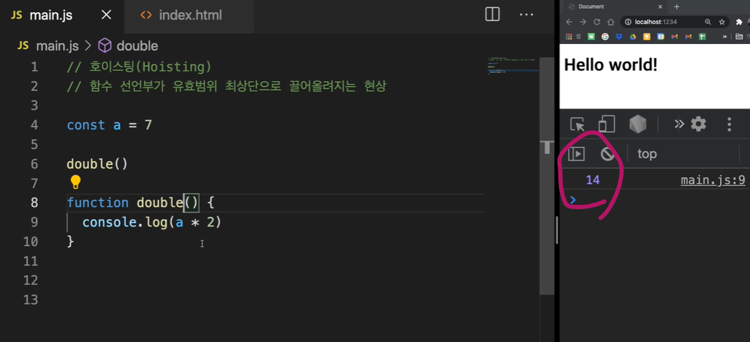 | const a = 7 double() function double() { console.log( a * 2 ) } |