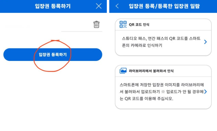 그리고 구입하신 입장권의 큐알코드를 등록 할 수 있는데요.